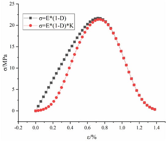 Figure 5 shows the stress-strain curve with or without  at  = 1.3,  = 1.65,  = 3650,  = −10 and  = 3. As seen from the figure, the improved Weibull model can accurately describe the process of transition from the compression stage to the elastic stage, yield stage and damage stage during the compression process of the rock mass. It overcomes the shortcomings of the original Weibull model and is closer to reality.
