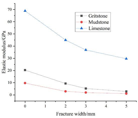The macroscopic damage model described above can effectively describe the weakening effect of fractures on the elastic modulus of rocks. However, in previous studies, the width of the fracture is usually assumed to be zero, thereby ignoring the effect caused by the width of the fracture. It is known from the previous studies [,] that the fracture width has a significant impact on the mechanical properties of the rock. In particular, the injection of slurry will inevitably lead to the deformation and opening of the original fractures. In view of this, the fracture width should not be neglected in the study of the damage constitutive model. According to the reference, the effect of the fracture width on the mechanical properties of the rock mass is shown in Table 1 and Figure 7, and the equivalent elastic modulus of the fractured rock mass decreases nonlinearly with increasing fracture width.