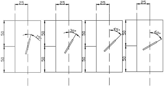 - The test specimens were divided into intact specimens and prefabricated fracture specimens. Non-through fractures were cut in the complete specimens by using a waterjet at fracture angles of 15°, 30°, 45° and 60°; a width of 2 mm; and a length of 30 mm, as shown in Figure 8.
