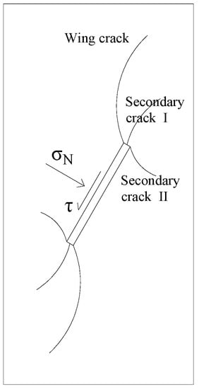 The newly emerged cracks at or adjacent to the fracture tip are classified into winged cracks and secondary cracks. The stress state model of the rock containing prefabricated fractures in uniaxial compression is shown in Figure 9. According to linear elastic fracture mechanics, when the stress at the fracture tip is less than the critical stress, no crack extension occurs. When the stress at the tip is greater than or equal to the critical stress, wing cracks are produced at the fracture tip and occur at the two initial fracture ends. The wing crack is the initial crack, which appears first and then continues to develop in the form of a curve along the direction of the maximum principal stress as the load increases. The crack has a narrow and smooth surface with a moderate development trend, which is a tension crack. Secondary cracks are also produced at or near the tip of the prefabricated fracture, which are divided into Types I and II according to the direction of the crack. The secondary cracks show a zigzag crack trend and significant signs of friction on the crack surface and rough surface, and the shear stress has a driving effect on the expansion of the secondary cracks, which can be characterized as shear damage, as shown in Figure 10.