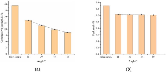 Table 2 and Figure 11 show the specimens’ compressive strength and peak strain. It can be seen from the figures that the presence of fractures causes a decrease in compressive strength and peak strain of the grouted rock mass compared with the intact samples. The compressive strength of the intact sample was 38.9 MPa, while that of the grouted rock mass was 27.1 MPa at 15°, 22.76 MPa at 30°, 19.57 MPa at 45° and 17.26 MPa at 60°. The peak strain was 1.52% for the intact sample, 1.23% at 15°, 1.22% at 30°, 1.21% at 45° and 1.21% at 60°. When macroscopic damage is present in the rock mass, both the strength and stiffness are weakened.