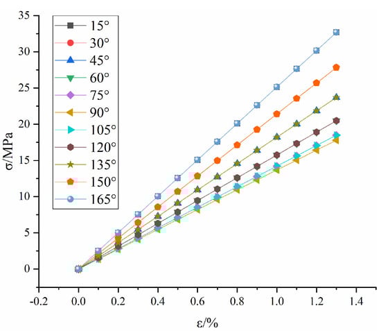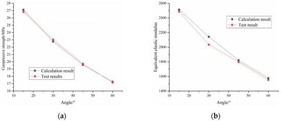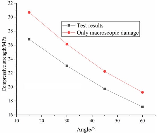 Figure 17 shows the stress-strain curve when only macroscopic damage  is considered. The stress-strain curve is a straight line, which cannot describe the changes in stress-strain at each stage. Figure 18 shows the comparison between the calculated results of compressive strength considering only macroscopic damage and the test results. It can be clearly seen that the calculation results can reflect the influence of the fracture angle on the compressive strength but the calculated results are obviously larger than the test results. This indicates that it is not enough to consider the macroscopic damage alone.