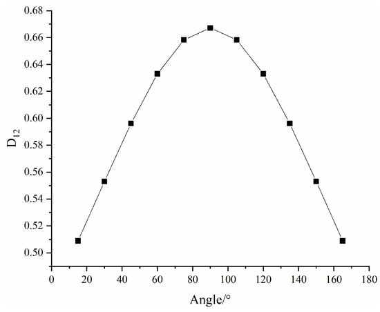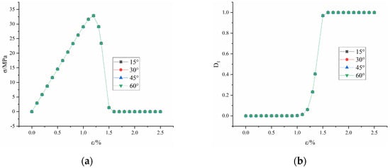 As shown in Figure 15a, the macroscopic damage  increases first before stabilizing with fracture width. Due to the tensorization of the macroscopic damage, the damage value eventually stabilizes at 0.15731 for 15°, 0.3039 for 30°, 0.42979 for 45° and 0.51638 for 60°. This is consistent with the reference [], that is, the fractures have a greater impact on the compressive strength of the rock when they first appear, and this influence gradually decreases with increasing fracture width. Eventually, the macroscopic damage caused by the fractures to the rock mass will stabilize at a specific value.
