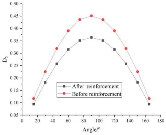 Figure 22 shows the evolution law of the macroscopic damage curve before and after grouting reinforcement based on the model derived in this paper. It can be seen from the figure that the macroscopic damage is significantly reduced after grouting reinforcement. The larger the fracture dip angle is, the better the grouting reinforcement effect, and the greater the effect of grouting reinforcement on macroscopic damage. The reason is that the effective contact area occupied by the grouting material becomes larger with decreasing fracture dip angle, so the grouting reinforcement effect is better. The model established in this paper accurately reflects the repair effect of grouting reinforcement on fractured rock masses.