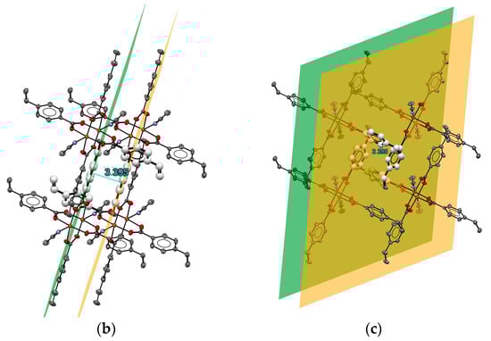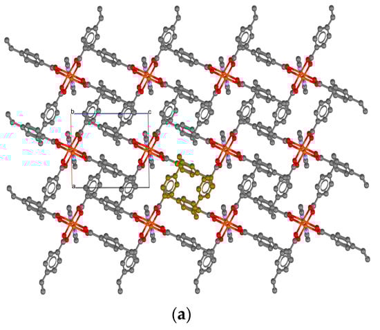 The spectrum showed a broad band at 3438 cm−1, which was assigned to the O—H stretching vibrations of lattice water molecules. A broad band between 1588 cm−1 and 1404 cm−1 was split and included the asymmetric νasym(COO−) and symmetric νsym(COO−); these were present because of the interactions by the 4-carboxylic groups of the vba ligands with the metallic ion. The value of Δν, which is the difference between the νasym(COO−) and symmetric νsym(COO−), was 184 cm−1. This was indicative of the coordination mode from the COO− to the copper ions [38]. This result could also indicate the symmetrical bridging coordination mode of the carboxylate (syn; syn-η1:η1:μ2), giving rise to a paddle-wheel-type structure. At 1694 cm−1, the CC signal from the vinyl group of vba ligands was found. A sharp signal at 1543 cm−1 was assigned to the aromatic double CC bonds. The signal of the Cu—O vibrations was located at 718 cm−1 [39,40,41]. The inset in Figure 3b allowed us to identify two main signals at 2298 and 2272 cm−1 that were assigned to the CN vibration modes of the MeCN. Comparing our results with those of the systematic studies by [2], only two signals were identified after the elimination of the Cu2+-coordinated MeCN by an exchange with H2O. These were from 2350 to 2200 cm−1, in the region assigned to the presence of the [Cu(MeCN)4]+ complex. The mechanism for the formation of the Cu+ complex was proposed as a “ship-in-a-bottle” model, according to which the Cu+ and MeCN components were post-assembled in the small cage in the paddle-wheel complex after they had penetrated the cage [2]. As shown in the inset of Figure 3b, we noticed a diminishing signal at 2252 cm−1, which corresponded with only one CN vibration mode for the coordinated MeCN at the inorganic node of [Cu2(µ-vba)4(CH3CN)2].