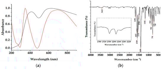 The synthesis of the copper paddle-wheel complex in acetonitrile resulted in the two solvent molecules being coordinated at the metal center; this was confirmed by single X-ray diffraction. After the crystals were immediately redissolved in a dimethylformamide solution, the molar conductivity measurement was ΛM 6.0 Ω−1 cm2 mol−1, as expected for a non-electrolyte compound in which the ligands were coordinated with the metal ion [33]. To identify the electronic transition bands of the copper complex, the solid-state diffuse reflectance spectra was analyzed. Two main reflectance bands were observed. A comparison between the diffuse reflectance spectra of a fresh sample against others exposed to humidity is shown in Figure 3a (black and red lines, respectively). An evident shift in the bands was observed. The maximum absorption at 414.7 nm in the black spectrum was displaced to 348.4 nm in the red one; either of the observed signals could be attributed to ligand–metal charge transitions. These electronic transitions have previously been identified in several polymeric copper carboxylic compounds. In the visible region, the maximum absorption at 626.9 nm in the black spectrum shifted to 694.4 nm in the red one. These electronic transitions could be attributed to the d–d transitions of copper(II) complexes with a square-based pyramidal coordination environment [34,35]. The green color of the Cu(II)-complex crystals was conserved, provided that they remained in their mother liquor of MeCN. When the crystals were isolated and exposed to environmental moisture, their color gradually turned pale blue. The color changes and the observed band displacements in the reflectance spectra, as shown in Figure 3a, could be associated with the ability of the Cu(II) paddle wheel to replace the pre-coordinated MeCN solvent by other Lewis-base polar guest molecules, as has been previously reported for other Cu(II) paddle-wheel-like structures [1,36]. The dynamic decoordination–coordination behavior of the acetonitrile-promoted copper sites was observed with the possibility of acting as Lewis acids; therefore, a catalytic property of the material could be speculated. Several commercial materials, such as the known HKUST-1 or Basolite, along with the interesting topology of the Cu(II) paddle wheel, can be used as important catalyst materials [37]. Therefore, we posited that sufficiently fed H2O molecules with environmental moisture could be coordinated to the metal center of a paddle wheel whose structure was preserved. The mid-infrared spectrum shown in Figure 3b supports the characterization of the copper complex structural integrity. The expected signals due to the ligand and solvent molecules were identified.
