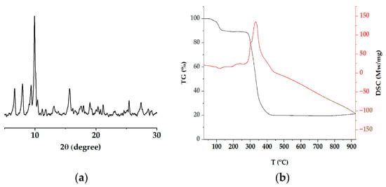 Powder X-ray diffractogram (a) and thermal analyses curves (TGA and DSC, black and red lines, respectively) (b) for the copper complex.