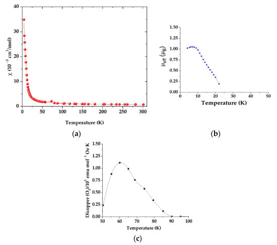 The magnetic properties of the copper complex as a function of temperature are shown in Figure 5. The magnetic susceptibility curve in Figure 5a exhibits a behavior characteristic of antiferromagnetically coupled copper(II) pairs. As shown in Figure 5b, the magnetic moment reached a µeff of 1.05 B.M. at 7 K. The coupling interaction between unpaired electrons in dimeric paddle-wheel structural systems has been shown to occur through the super-exchange pathway, rather than through direct interactions between the two central copper atoms, with a binuclear oxygen-bridged structure to vba ligands [45]. Figure 5c shows a detected peak from 50 to 100 K, which was associated with the oxygen absorption by the structure of the Cu(II) paddle wheel [45]. At room temperature, the corrected molar magnetic susceptibility χMcorr was 7.689 × 10−4 cm3/mol; when corrected for diamagnetism, it was −405.9 × 10−6 cm3/mol [21]. The complex had a magnetic moment µeff of 1.36 B.M. at 300 K. This value corresponds well with those of similar complexes, previously reported [31].