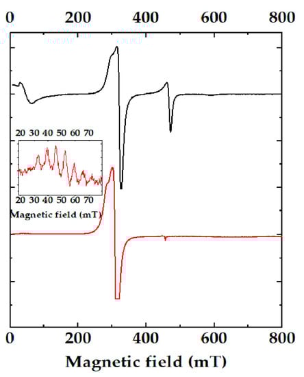 Electronic paramagnetic resonance spectra of the copper complex at room temperature (black line) and in a solid state at 77 K (red line). The inset corresponds with the pattern of seven hyperfine lines.