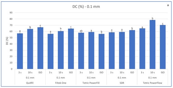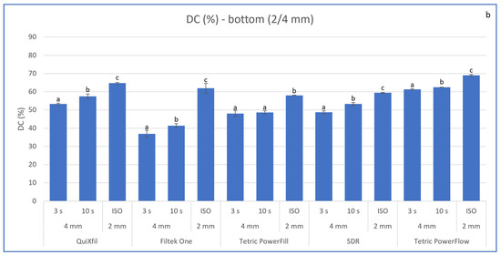Comparison of mean DC (%) values (±SD) between polymerisation protocols within each time point for (a) 0.1 mm and (b) bottom at 2 or 4 mm. Identical letters indicate statistically homogeneous groups within the material.