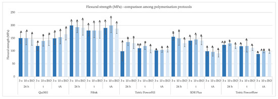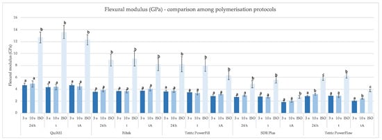 Figure 3 and Figure 4 show the FS values of all materials considering three time points and different polymerisation protocols. In general, Filtek One had the highest FS values, which were not affected by polymerisation protocols or artificial ageing. Figure 3 shows how the 3 s polymerisation protocol only had a negative effect on the FS of Tetric PowerFill after 24 h, but these differences were balanced out with the ISO protocol after thermocycling and thermocycling with exposure to absolute ethanol. In general, the FS after thermocycling with exposure to absolute ethanol, was statistically similar for all polymerisation protocols, except for Tetric PowerFlow.