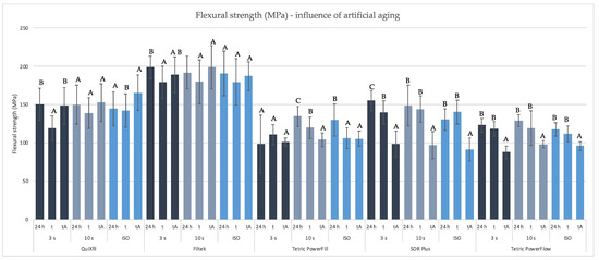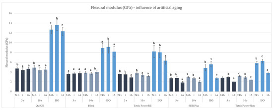 Comparing each material individually in Figure 6, a non-uniform deterioration in FM after aging was observed. Some specimens did not show the expected deterioration of the FM after thermocycling. Moreover, their values were higher than the values of the same group measured after 24 h.