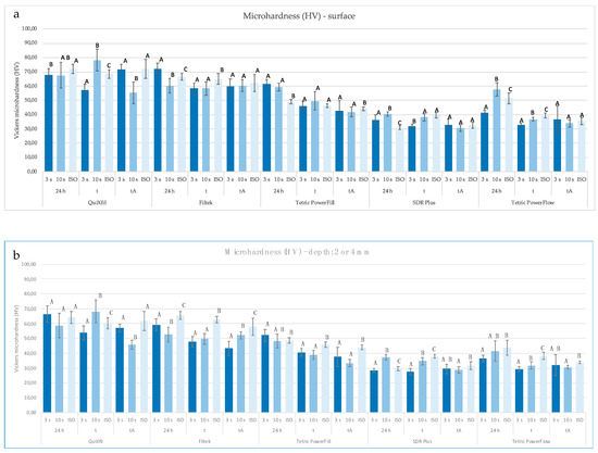 In Figure 7a,b, two of three high-viscosity bulk-fill composites (of which Filtek One on the lower surface, and QuiXfil on the upper surface) showed a reduction in the MH value due to polymerisation with the 3 s protocol, compared to the ISO protocol. The same effect applies to one of the two tested low-viscosity bulk-fill composites (Tetric PowerFlow), regardless of the surface of the specimen.