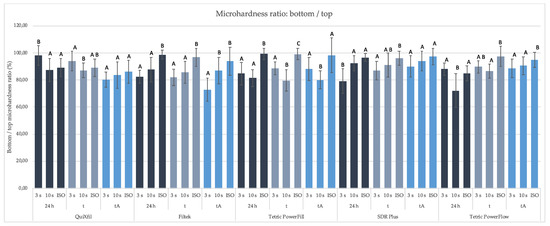 Comparing different polymerisation protocols within the same time points, the values of MH on the surface (Figure 7a) and on the bottom of the specimen (Figure 7b) are shown. Figure 8 shows the ratio of MH (%) on the bottom and on the surface (bottom/top ratio) of the specimen.