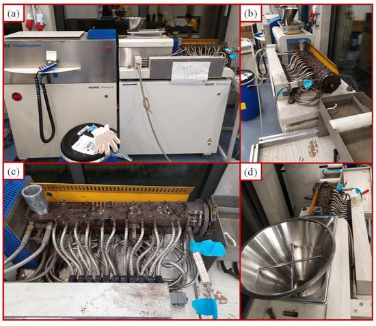 HAAKE Rheomex extruder (a), die zone (b), extrusion channel (c), and feed zone (d).