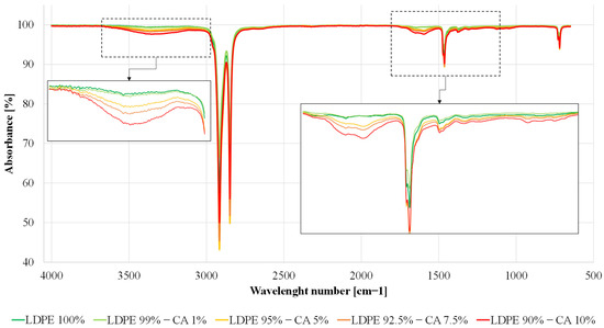 FT-IR analyses were performed using a Nicolet apparatus (Thermo Scientific, Italy) at ambient temperature to determine the effect of different amounts of CAT on the degradation of LDPE during the mechanical recycling process. The samples were analyzed in ATR mode from 4000 to 600 cm−1 with a wavenumber resolution of 4 cm−1 and an average of 64 scans.