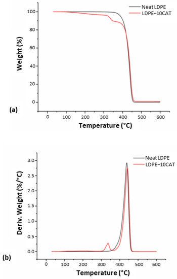TGA (a) and DTG (b) curves for neat LDPE and LDPE-10CAT.