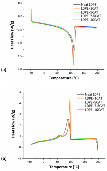 It is important to mention that the glass transition temperature (Tg) of neat CAT is 127 °C, as previously reported [30]. However, no individual transition corresponding to Tg was observed in any of the LDPE–CAT thermograms shown in Figure 6a, suggesting that the loss of triacetin during the extrusion process caused CAT to return to its native form with a Tg of about 198 °C. This Tg value is too close to the upper limit of the temperature range considered in the DSC measurements.