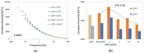 (a) Complex viscosity curves of neat LDPE and LDPE composites, (b) complex viscosity as function of CAT content at a frequency of 0.1 Hz (values from a commercial LDPE are represented with a lighter/striped pattern while the ones related to the tested LDPE are represented with the pattern as explained by the legend).