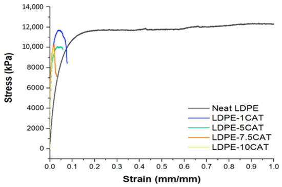 Representative stress–strain curves of neat LDPE and LDPE–CAT blends.