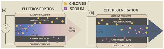 A CDI unit comprises two porous electrodes (often carbon electrodes) and a separator (either a porous dielectric material or an open channel) [26]. Typically, the electrodes are treated to a potential difference of 1–1.4 V [27]. The saline or contaminated water passes between the positive and negative electrodes, where the unwanted ions in the water move into an electric double layer (EDL) along the electrode–water interface, thereby removing the unwanted salts or contaminants [28] via electrosorption on the electrode surfaces (Figure 1a). During the discharging step “desorption process” [29], the ions are trapped electrostatically at the electrode surface and then released by reversing the polarity. (Figure 1b). CDI unit can complete countless adsorption–desorption cycles. The deterioration of the electrodes will limit the lifespan of the cell. Oxygen and some organic molecules contained in water may destroy electrodes by oxidation [30], hence lowering the electrosorption capacity and the lifespan of the cell [31,32].