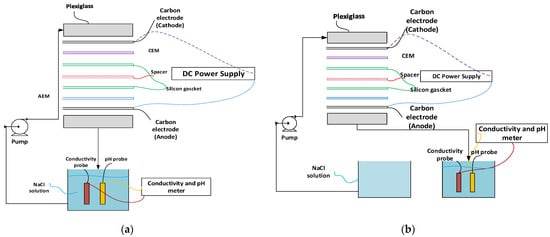 Plexiglass sheets with a thickness of 5 millimetres are used to construct the cell. Two electrodes create the capacitive deionization cell. Each electrode has an average thickness of 170 ± 20 µm and a carbon mass of 7.5 ± 0.5 mg/cm2. Before the desalination test, the carbon electrodes were activated with three repeated polarization cycles, first by applying a voltage of 1.2 V over 10 min for the charging step, and then 0 V over 10 min for the discharging step. As an MCDI cell, cation and anion exchange membranes were explained in detail in our previous work [78] and were brought forward in front of the positively charged electrode and the negatively charged electrode, respectively. A non-conductive spacer was inserted into the 1 mm gap that existed between the membranes in order to both stop electrical short-circuiting and creates the flow channel. To maintain a consistent electrical voltage throughout the device, a DC power supply was used. In order to regulate the volume of the feed’s flow, a peristaltic pump was used. A data logger (DT 85) sent the data that were measured by conductivity and pH sensors to a computer that was in a laboratory. Figure 2 contains a diagrammatic representation of the MCDI set-up as well as all the layers that are included inside the MCDI cell for batch and SP modes of operation. The process of adsorption was carried out at a consistent electrical voltage of 1.4 V, whereas the process of desorption took place at a voltage of zero in CDI and a voltage with the opposite polarity of 1.4 V in MCDI. Each experiment was carried out not once, but twice, and the findings that are reported here are the culmination of an adequate number of absorption and desorption cycles that were carried out in order to guarantee consistent behaviour between each cycle.