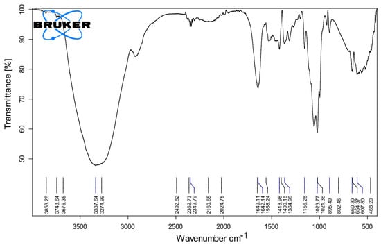 The Fourier transform infrared (FTIR) spectra of the membrane that was fabricated, as depicted in Figure 3, indicate the presence of an OH functional group within the range of 3000–3750 m−1. In addition to the conventional hydroxyl group, which imparts super-hydrophilicity to the membrane by virtue of three hydroxyl (OH) groups per anhydro-glucose unit, the supplementary peak observed at 1640–1630 m−1 elucidates the process of water adsorption. This peak facilitates the disruption and formation of hydrogen bonds in water, thereby promoting rapid water permeation across the membrane. In addition, the observed peak at 1125–1170 m−1 can be attributed to the asymmetric stretching vibration of the C–O–C bond in the arabinose side chain. Similarly, the peak at 1040–1050 m−1 corresponds to the stretching of the C–O bond in the C–O–C glycosidic bonds, providing evidence for the existence of ether linkages between the anhydro-glucose units and the asymmetric stretching of the arabinose side chain. Furthermore, it was determined that none of the solvents or additives were retained within the membrane matrix and subsequently released during the processes of coagulation and post-washing. The Fourier transform infrared (FTIR) spectra analysis revealed that the addition of ion exchange resin (IER) did not result in any notable alterations to the structure of the membrane.