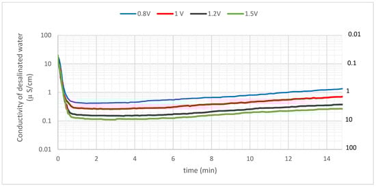 The production process for semiconductors requires ultrapure water (UPW) with a resistivity of 18 ΩM cm, while the pharmaceutical and medical sectors employ UPW with a resistivity of roughly 1–10 ΩM cm. As can be observed in Figure 3, the electrical resistivity of the effluent remained higher than 1 ΩM cm at every cell potential that was tested. In particular, the findings point to the fact that a UPW of around 10 M Ω cm may be achieved by applying a potential of 1.5 V. The standard MCDI technique with carbon electrodes operates at a voltage of around 1.2 V [98,99,100]. Based on these findings, we concluded that the MCDI technology makes it possible to readily generate UPW of the quality that is needed by several businesses.