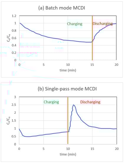 Experiments using batch mode test the conductivity of the feed reservoir, which may be a much lower volume than the reservoir measured using SP mode. When conducting batch mode measurements, the capacity of the feed reservoir must be kept to a minimum because, otherwise, the conductivity changes that occur are much too minute to be recorded correctly. Experiments performed by batch mode reveal that conductivity gradually decreases as time passes. When the electrode reaches its saturation point, the conductivity will settle down to its lowest possible value (maximum salt adsorption). The number of ions that were eliminated may be calculated by comparing the levels of conductivity at the beginning and the end of the process. While batch mode has the benefit of it being easier to operate and analyse the data, a single pass is more reflective of industrial MCDI due to the fact that the feed is not continually recycled, and the effluent is collected [81].