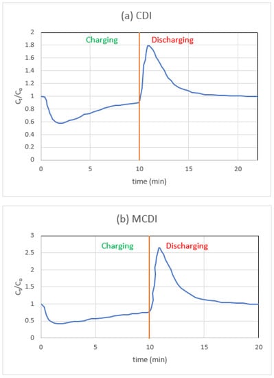 Figure 6a depicts the fluctuation in CDI concentration across a single cycle. Looking at Figure 4a more closely, we see that there is a little rise at the start of each adsorption phase. Since the voltage during regeneration is zero, an undesirable amount of co-ion adsorption will occur during this desorption process. Therefore, a sudden repulsion of these co-ions occurs when reapplying the cell voltage during the second adsorption stage, leading to a repulsion peak [48].