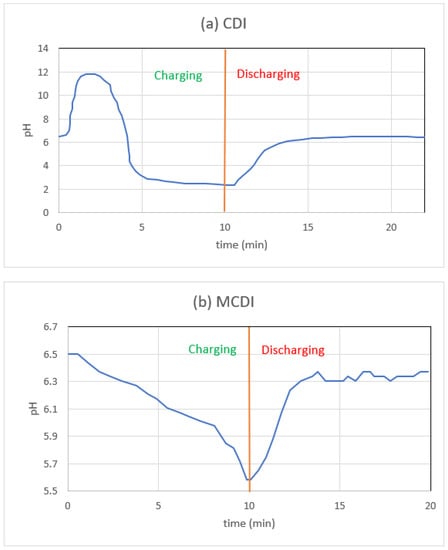 However, as shown in Figure 7b, MCDI’s pH change range is narrower than that of CDI, especially during the early increase. The reasons for this could be a variety of things. When the CEM is positioned in front of the cathode, dissolved oxygen is blocked from reaching the carbon surface. The recent paper by Tang et al. [51] makes use of this same line of reasoning. Secondly, even if some oxygen does make it to the cathode, the OH− that is created in the process has a hard time crossing the CEM and entering the bulk solution. Thus, reaction redox potentials are not affected by the absence of the initial pH jump. Because of the AEM, the generated H+ ions have a hard time making their way into the bulk stream. We further postulate that hydroxyl and hydronium ions, if they are indeed trapped behind each ion-exchange membrane, can boost the counter-ion attraction.