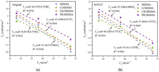 According to the measurement of the contact angle, with ΓL as the horizontal axis and ΓL cosθ as the vertical axis, a fitting analysis was conducted on the contact angle data of three test liquids with the original, short-term aging, and long-term aging asphalt samples. The fitting results are shown in Figure 7.