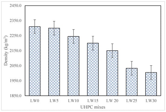 - As lightweight fine aggregates increased from 5% to 30%, the UHPC density decreased, with 30% mixtures showing the lowest density. Lightweight aggregates’ lower specific gravity and higher porosity reduced overall density. Including 30% lightweight aggregates lowered the concrete density from 2310 kg/m3 to 2005 kg/m3.