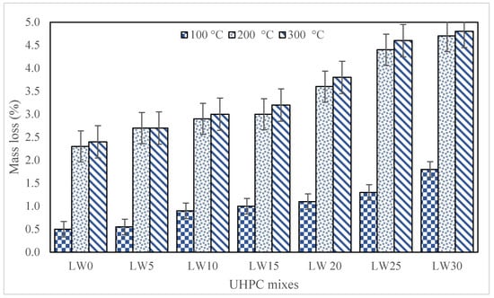 The mass loss in ultra-high-performance lightweight aggregate concrete when subjected to 100 °C, 200 °C, and 300 °C is presented in Figure 4. Figure 4 shows that as the percentage of lightweight aggregates increased from 0% to 30%, the mass loss in the UHPC mixture also increased with increasing temperature. One possible explanation for why the mass loss in the UHPC was higher when the fine aggregates were replaced with a lightweight pumice aggregate from 0% to 30%, with the mixture containing 30% pumice having the highest mass loss, is that the lightweight aggregate may have lower thermal stability than the fine aggregates. At 300 °C, the LW30 had 4.8% mass loss, whereas LW0 had only 2.4%. When UHPC is exposed to high temperatures, the lightweight aggregate may break down faster than the fine aggregate, leading to more significant mass loss. This is because lightweight aggregates often have higher porosity, which allows them to absorb more moisture and other contaminants, making them more vulnerable to thermal degradation. UHPC is susceptible to damage when exposed to high temperatures [55]. When UHPC is exposed to temperatures above 100 degrees Celsius, it can experience thermal degradation, leading to mass loss, cracking, and other forms of damage. In addition to porosity, the chemical composition of the lightweight aggregate may also play a role in the higher mass loss observed in the UHPC mixtures containing the lightweight aggregate [56]. Pumice, for example, is a volcanic rock that contains significant amounts of water and other volatile compounds. When exposed to high temperatures, these compounds may be released from the lightweight aggregate, contributing to the mass loss of the UHPC [57]. Another factor that may contribute to the higher mass loss in the UHPC containing the lightweight aggregate is the difference in thermal expansion between the lightweight and fine aggregates. When UHPC is exposed to high temperatures, the different thermal expansion rates between the two aggregates can lead to internal stresses, which can cause cracking and other damage [58].