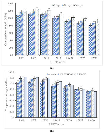 Compressive strength of UHPC: (a) at 7, 28, and 56 days of curing; (b) at ambient and after elevated temperature.