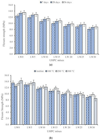 Flexural strength of UHPC: (a) at 7, 28, and 56 days of curing; (b) at ambient and after elevated temperature.