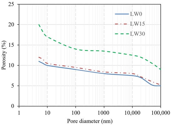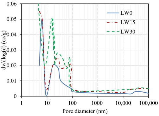 In Figure 8, the graph’s x-axis represents the pore diameter, which ranges from 1 to 100,000, and the y-axis represents dV/dlog(d) (cc/g), which measures the material’s pore volume per unit mass. The pore structure of UHPC is an essential factor in determining its mechanical properties, particularly its strength and durability. The graph shows three lines, each representing a different percentage of lightweight aggregates in the UHPC mix. The first line defines the UHPC mix without any lightweight aggregates (0%), the second line represents the mix with 15% lightweight aggregates, and the third line represents the mix with 30% lightweight aggregates. The lines intersect at various points on the graph, indicating changes in the pore structure as the percentage of lightweight aggregates in the mix changes. The points of intersection can be used to identify the threshold at which the addition of lightweight aggregates begins to impact the pore structure of the UHPC significantly. By analyzing the trends and points of intersection of the lines, important insights can be drawn about the effects of lightweight aggregates on the pore structure of the UHPC. For example, the graph reveals that the addition of lightweight aggregates increases the overall porosity of the UHPC but that there is a limit beyond which further additions have diminishing returns [80]. Overall, Figure 8 provides a visual representation of the impact of different amounts of lightweight aggregates on the pore structure of the UHPC, which is a critical factor in the material’s strength and durability. The results of this study can have important implications for developing new, high-performance concrete materials with improved properties, particularly in applications where weight reduction is a crucial consideration [81].