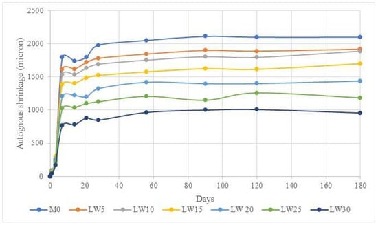 The effect of replacing fine aggregates with lightweight pumice aggregates on the shrinkage of the UHPC is displayed in Figure 9. The test result showed that increasing the percentage of LWAs reduced the shrinkage of the UHPC. The reduction in autogenous shrinkage of the ultra-high-performance concrete as the percentage of lightweight aggregates increased can be attributed to several factors. Autogenous shrinkage is a phenomenon that occurs in concrete due to autogenous drying, which is caused by the ongoing hydration reactions in the cement paste. This phenomenon can lead to the development of tensile stresses in the concrete, which can cause cracking and other forms of damage [82]. Adding LWAs as a partial substitute for fine aggregates in UHPC can help mitigate this problem by reducing the amount of cement paste in the mix and the overall volume changes during hydration. This reduction in the cement paste content results in lower internal relative humidity and a decrease in the amount of water available for autogenous drying, which in turn leads to a reduction in autogenous shrinkage [10]. The presence of lightweight aggregates in the UHPC mix also provides a better internal drainage system, which allows the excess water to escape more quickly, reducing the overall shrinkage of the concrete. This improved drainage is due to the larger pores in the LWA, which can help to transport the excess water more efficiently than the smaller pores in the cement paste. This enhanced drainage can further reduce the amount of internal moisture available for self-desiccation and minimize the risk of cracking [83]. In addition, using a LWA in UHPC can also improve the material’s durability by reducing the concrete’s permeability. This is because the LWA acts as a barrier to the penetration of water and other harmful substances, preventing them from reaching the internal surfaces of the concrete and causing damage [84]. The study results showed that the sample with 0% LWA had the highest shrinkage (2100 microns) at all corresponding curing days, while the sample with 30% LWA had the lowermost (958 microns) shrinkage across all curing days. This highlights the beneficial effect of LWAs on the autogenous shrinkage of UHPC and provides valuable insights into using LWAs as a partial substitute for fine aggregates in UHPC to improve its properties.