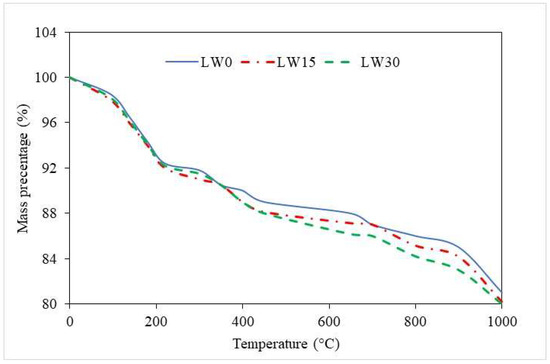 Furthermore, the decrease in the mass percentage of the UHPC mixture with an increase in LWA percentage is observed across all curing days, indicating that this effect is not limited to a specific point in the curing process. This is likely because the thermal properties of the LWA are not affected significantly by the curing process [85]. Therefore, the reduction in mass percentage observed at higher temperatures is consistent throughout the curing period. The sample with 0% LWA had the highest mass percentage at all corresponding temperatures, indicating that the absence of lightweight aggregates leads to a denser UHPC mixture. On the other hand, the sample with 30% LWA had the lowest mass percentage compared to LW0 and LW15 across all curing days, indicating that a high percentage of LWAs leads to a less dense UHPC mixture [86].