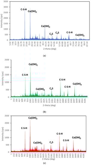 The first XRD spectrum (see Figure 11a), which corresponds to the UHPC sample with 0% replacement of fine aggregates with pumice, shows the highest peaks of portlandite (Ca(OH)2), calcium-silicate-hydrate (C-S-H), and ettringite intensities. This suggests that the UHPC sample with no replacement of fine aggregates has higher crystallinity than the other samples. Sharp and intense peaks in the spectrum may indicate the presence of highly crystalline phases in the material [87], such as portlandite, a typical phase in cement-based materials. The second XRD spectrum (see Figure 11b), which corresponds to the UHPC sample with 15% replacement of fine aggregates with pumice, shows lower peak portlandite, C-S-H, and ettringite intensities than the first spectrum. This suggests that replacing fine aggregates with pumice has decreased the crystallinity of the UHPC. Some of the same peaks as the first spectrum indicate that the UHPC sample with 15% replacement still contains some of the same crystalline phases as the UHPC sample with 0% replacement. The third XRD spectrum (see Figure 11c), which corresponds to the UHPC sample with 30% replacement of fine aggregates with pumice, shows an even lower peak of portlandite, calcium-silicate-hydrate, and ettringite intensities than the second spectrum. This suggests that replacing fine aggregates with pumice has further decreased the crystallinity of the UHPC [88]. Fewer peaks in the spectrum compared to the first two spectra may indicate that the UHPC sample with 30% replacement contains fewer highly crystalline phases.