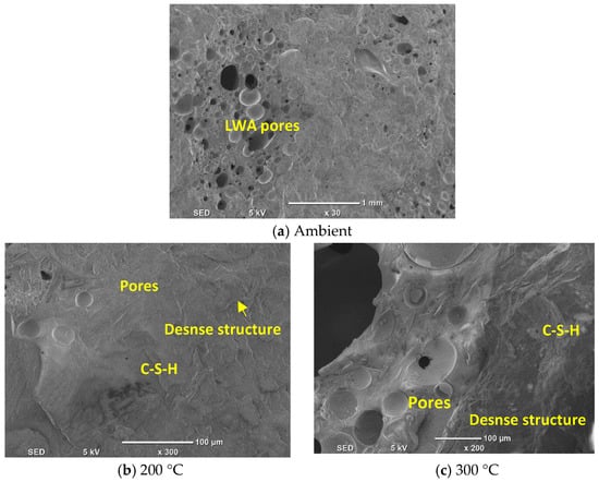 Upon inspection of Figure 12a, it can be seen that the unheated UHPC specimen containing 0% LWA has a complex internal microstructure. The SEM image reveals the presence of various constituents, such as hydration products, un-hydrated cementitious material particles, aggregates, pores, and air voids. The main hydration products identified are calcium silicate hydrate gels and calcium hydroxide crystals [89]. The compact interface between the aggregate and matrix is particularly noteworthy, suggesting strong bonding between the two phases. The SEM image also shows the presence of relatively larger pores, which could be attributed to incomplete filling of the voids during casting or bleeding of the mixture. When the UHPC specimen is heated, the microstructure changes significantly. The SEM image in Figure 12b,c shows a more homogeneous microstructure with fewer visible pores and a denser matrix. The reduction in porosity and increased density can be attributed to the heat treatment, which results in further hydration of the cementitious materials and improved bonding between the matrix and aggregates [90]. The densification of the microstructure leads to higher strength and durability of the UHPC. The SEM images of the UHPC specimens containing 30% LWA (Figure 13) show a similar trend to those with 0% LWA. The unheated specimen (Figure 13a) displays a more heterogeneous microstructure compared to the heated specimen (Figure 13a,b), with a range of particle sizes and shapes visible in the matrix. However, in contrast to the specimen with 0% LWA, the presence of the LWA particles is visible in the SEM images. The LWA particles are observed to have a distinct morphology and are generally well distributed within the matrix.