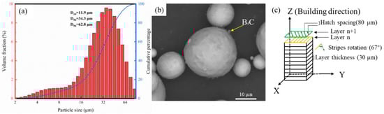 (a) Distribution of particle size for the Ti + B4C mixture, (b) SE image of the Ti + B4C mixture, and (c) schematic illustration of the laser scanning strategy.
