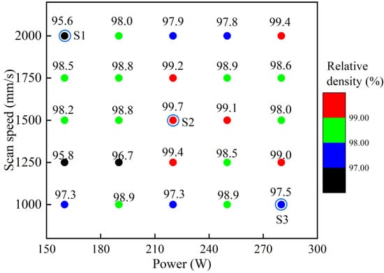where Wa and W are the weights of the sample in air and water, respectively, and is the density of the water. The density machine is Sartorius MSA324S-000-DU and each reported value is the average of three measurements. The theoretical density of Ti composite is 4.486 g/cm3. After analyzing the relative density results (Figure 2), the three specimens (named S1, S2, and S3) with VED values ranging from 33 to 117 J/mm3 are selected and discussed in this paper: the processing parameters associated with these specimens are listed in Table 2.