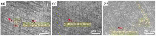 Figure 3 shows typical OM images of S1, S2 and S3 viewed in the x–y plane. The melt track, also known as the melt pool, can be clearly observed. It is evident that the rotation angle between melt tracks is about 67°, as expected. Micropores were presented in S1 resulting in lower relative density (~96%), which may be attributed to insufficient energy penetration at the lowest VED. The morphology of S2 was similar to that of S3. The excellent track-to-track bonding suggested that the alloys with a near-dense structure show good mechanical properties.