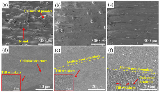 Figure 4d–f show typical microstructures of LPBF-ed samples in the x–y plane. The VED exerts a significant influence on the microstructure of the Ti + B4C composites. Unlike the other specimens, S1 exhibited cellular microstructure. As the VED increased from 61 J/mm3 to 117 J/mm3, a change to a columnar structure can be observed. The difference in microstructure is dependent on the complex solidification behaviors in the molten pool caused by various VED, which is discussed in Section 4.1. In addition, needle-like TiB whiskers of different sizes can be seen in all three samples. Clusters composed of TiB whiskers were present in the LPBF-ed microstructure, where parallel whiskers were stuck to each other. The TiB whiskers grew into this morphology due to the faster growth rate in the [010] axis than that in other directions [].