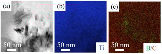 (a) BFTEM images of LPBF-ed S2; (b,c) corresponding EDS map showing the Ti and B/C distribution.