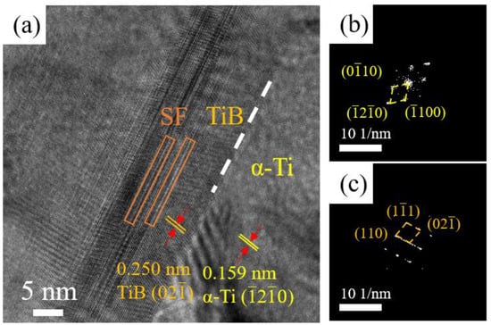 High-resolution TEM (HRTEM) was performed to examine the interface between the TiB whisker and the α-Ti matrix. Figure 7a shows a clean interface between the matrix and the reinforcing phase, illustrating good bonding between the TiB whisker and the α-Ti. The α-Ti matrix and TiB whiskers were identified via determining the lattice parameters to be 0.159 nm and 0.250 nm, respectively. However, the theoretical lattice spacing of α-Tid{110} is known to be 0.147 nm, which is smaller than the experimental results. Kværndrup et al. reported that the interstitial atoms (O, N, or H) dissolution into α-Ti leads to the increase of lattice parameter []. The results indicated that C is dissolved into Ti, leading to lattice spacing expansion. The corresponding fast Fourier transform (FFT) patterns of the LPBF-ed Ti + B4C composite are shown in Figure 7b,c, which further confirms the existence of the TiB whisker and the α-Ti phase. In addition, intense streaking in the direction of TiB (110) was observed, demonstrating the existence of stacking faults (SF) in the TiB (110) plane. Kooi et al. reported a similar structure in laser-clad Ti-TiB [].