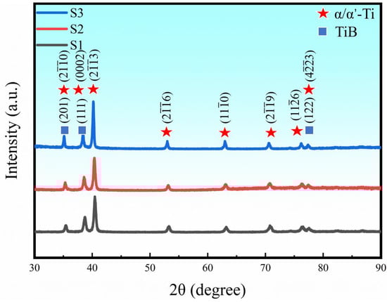 XRD patterns from S1, S2 and S3 are shown in Figure 8. Strong diffraction peaks from hexagonal Ti (HCP) and weak diffraction peaks from the small volume fraction of TiB were found. According to the Ti-B-C ternary phase diagram [], an in situ reaction occurred during the solidification processing of LPBF-ed samples: