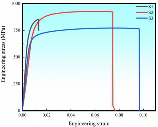 Tensile tests were conducted to evaluate the LPBF-ed B4C-reinforced Ti in situ composites and their representative engineering stress-engineering strain responses are displayed in Figure 9: values for the yield strength (YS), ultimate tensile strength (UTS), elongation (ε) is summarized in Table 3. S1 had the lowest relative density (95.6%) and exhibited the lowest ε, but had the highest YS at 768 ± 10 MPa. Compared with S1, the YS value of S2 was ~30 MPa less at 738 ± 6 MPa, but its ε increased from 1.7 ± 0.4% to 6.3 ± 1.1%, presumably due to a lower number of defects. Compared with S2, S3 had the similar ε at 7.4 ± 1.9%. However, S3 had a lower YS value (664 ± 9 MPa) than those of the other two specimens. As increasing VED, the pore morphology in Ti alloys changed from irregular shape to near-spherical shapes []. During tensile test, samples with spherical pores have a more uniform distribution of strain, which may lead to better ductility performance than that of samples with irregular pores. The decrease of YS can be attributed to the coarse grain in S3 caused by large energy input. As shown in Table 3, the introduction of B4C to pure Ti can achieve high tensile strength and reasonable elongation with comparison of pure Ti produced by LPBF, wrought or cast [,,,,].
