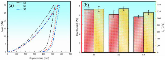 (a) Displacement-load response and (b) hardness and reduced Young’s modulus results of three samples.
